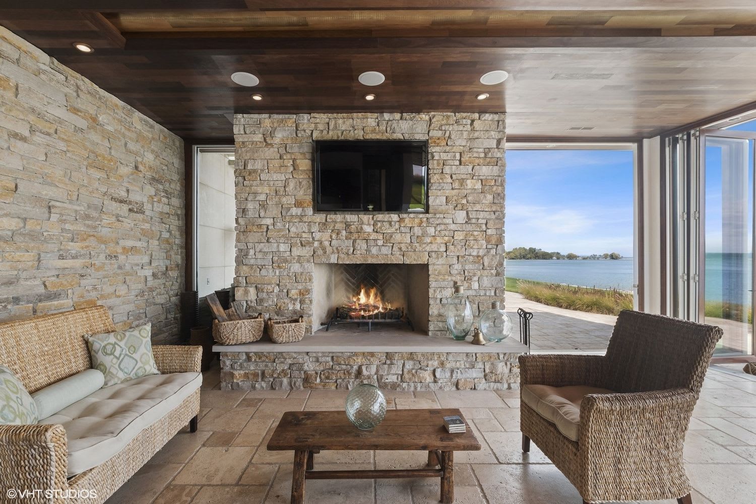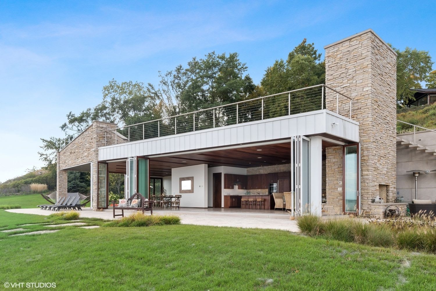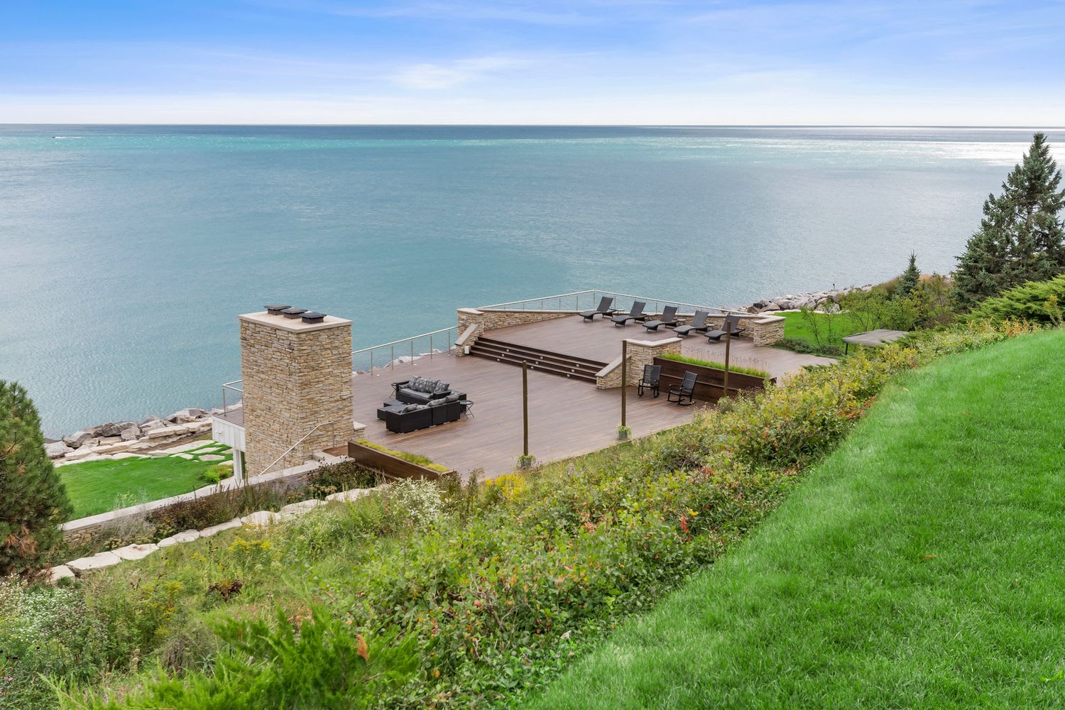 On this property, accessing the lakefront is easy. No steep stairs or tram is needed here. The bluff has been contoured to provide a gradual, broad grassy switchback allowing for a comfortable walk or golf cart ride down to the lake level. At the lake level is a boathouse unlike any other available on the North Shore, truly an incredible setup for entertaining. With over 3,000 square feet of space, it includes an Ipe wood roof deck above, two outdoor fireplaces, and stone patios. Inside, the entire east facade of sliding glass panoramic doors opens to the lake. Full kitchen, family room with fireplace, 2 baths. Room to store all your water toys, including sailboats, jet skis, kayaks, and canoes.