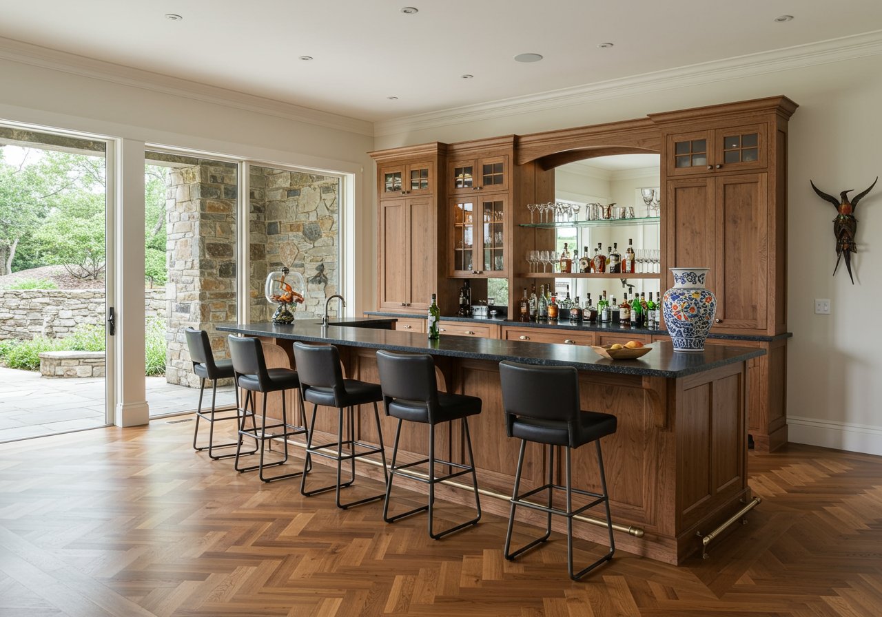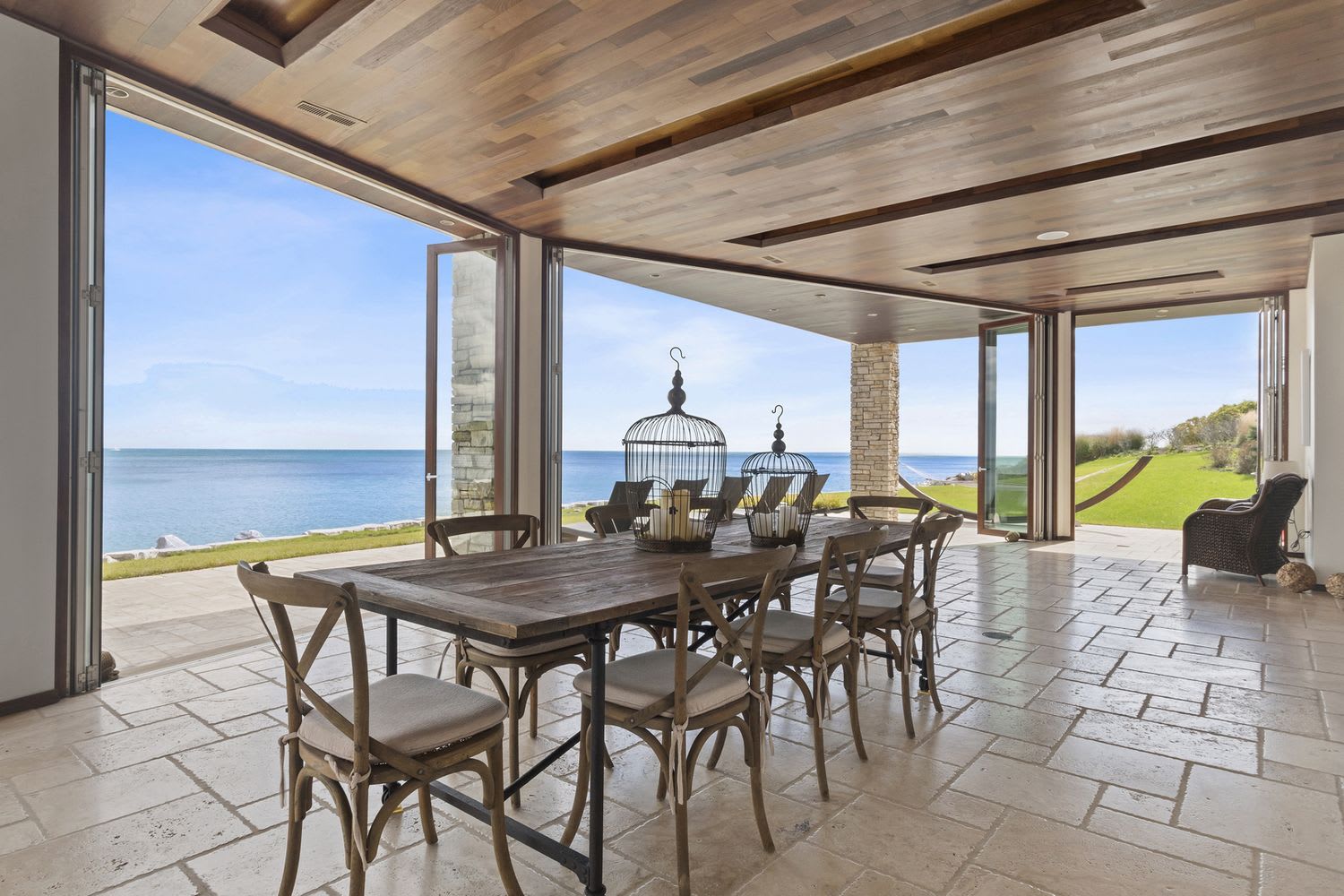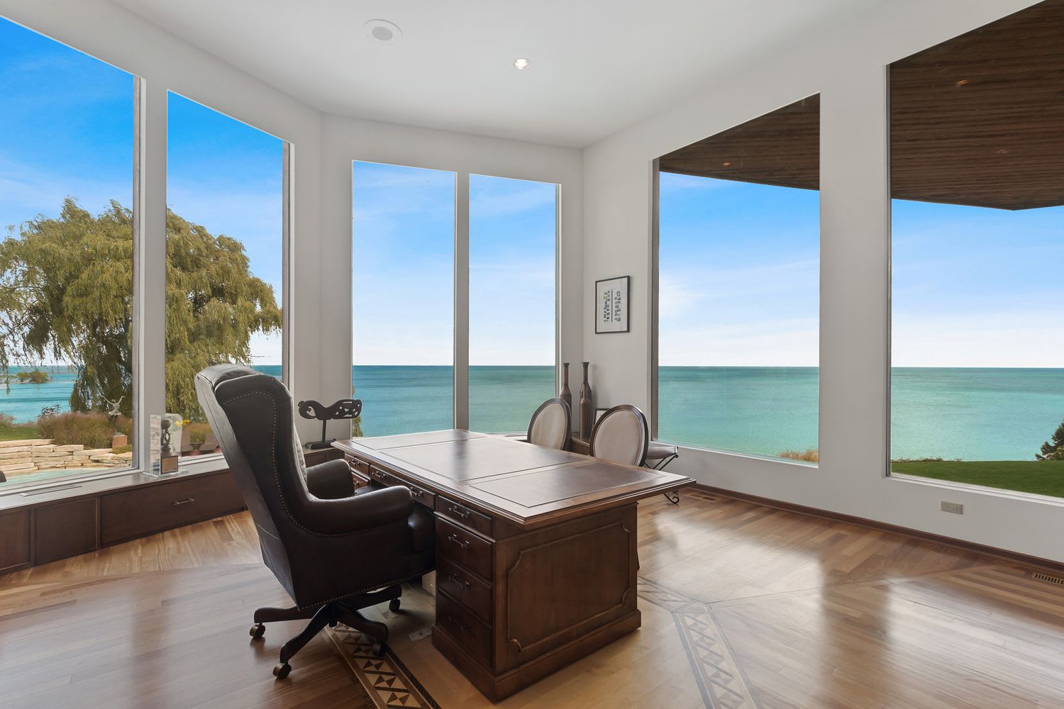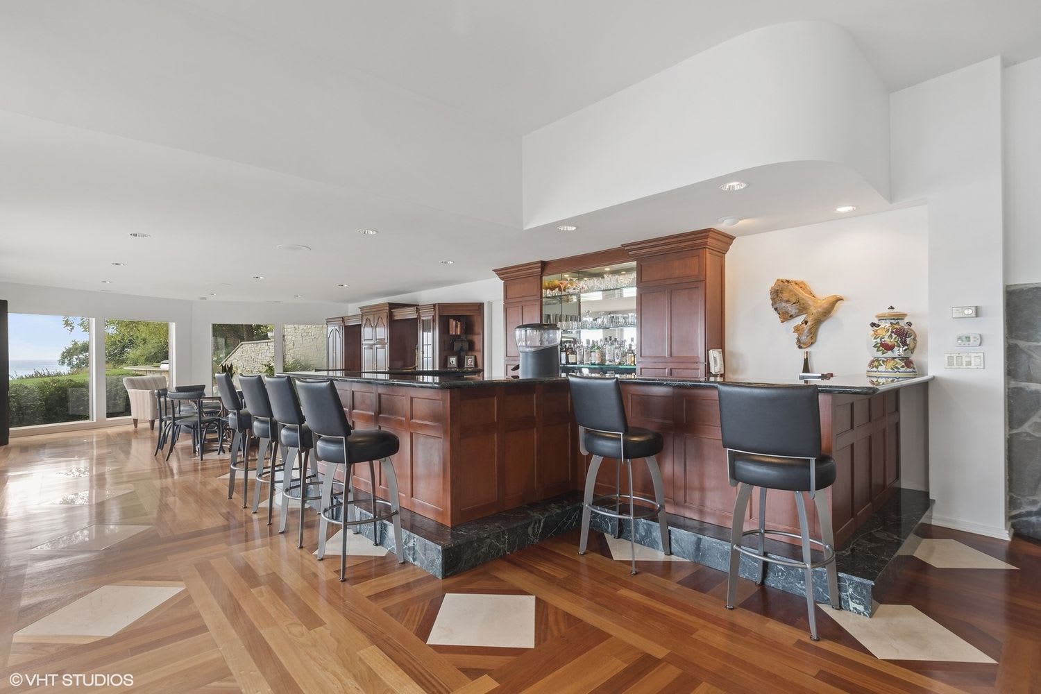 The six-bedroom main house is nearly 4800 sq ft and was constructed in 1989. It was built to entertain with an indoor pool/outdoor pool connected through a water tunnel, floor-to-ceiling windows offering stunning views of Lake Michigan, and an oversized finished basement complete with a bar that opens to an outdoor oasis. The indoor pool, set beneath a two-story glass ceiling, has a tunnel to the outdoor pool, whose “infinity edge” makes it appear to drop off into Lake Michigan. Other features include a large guest suite with its own living room and patio, a recently renovated garage with room for housing up to six cars, and an incredible pool house down below.