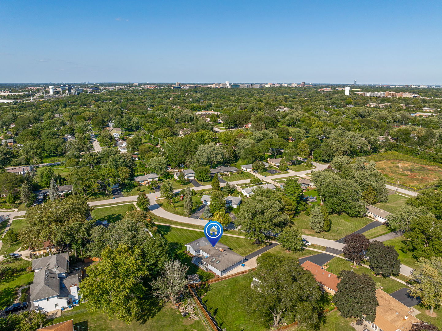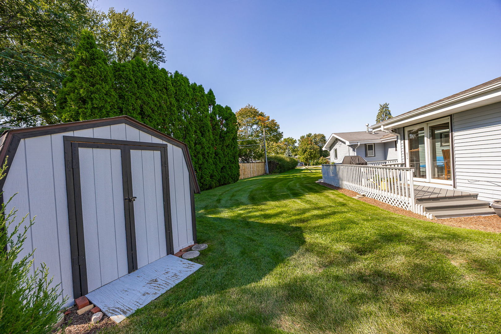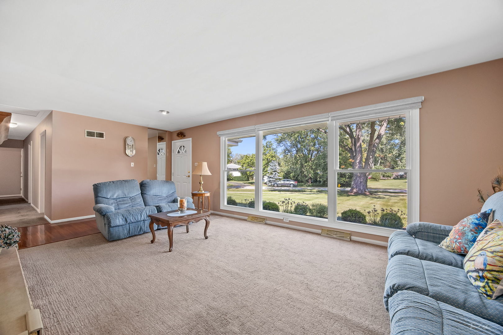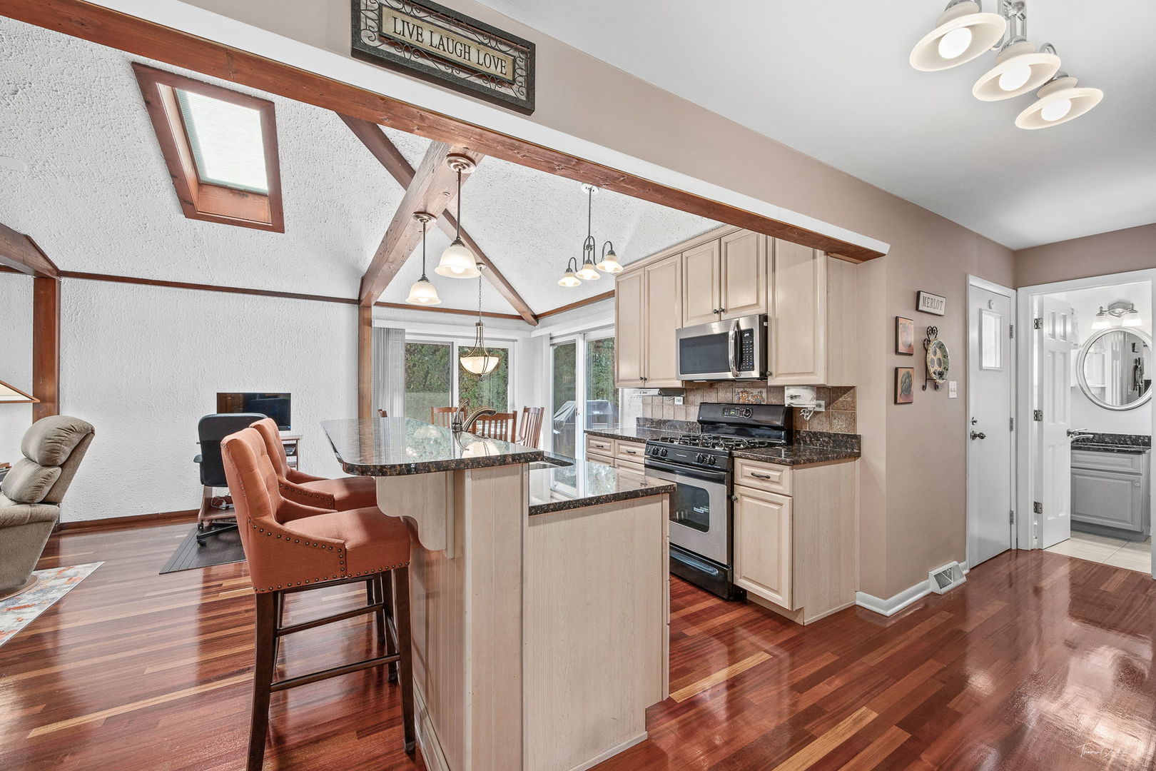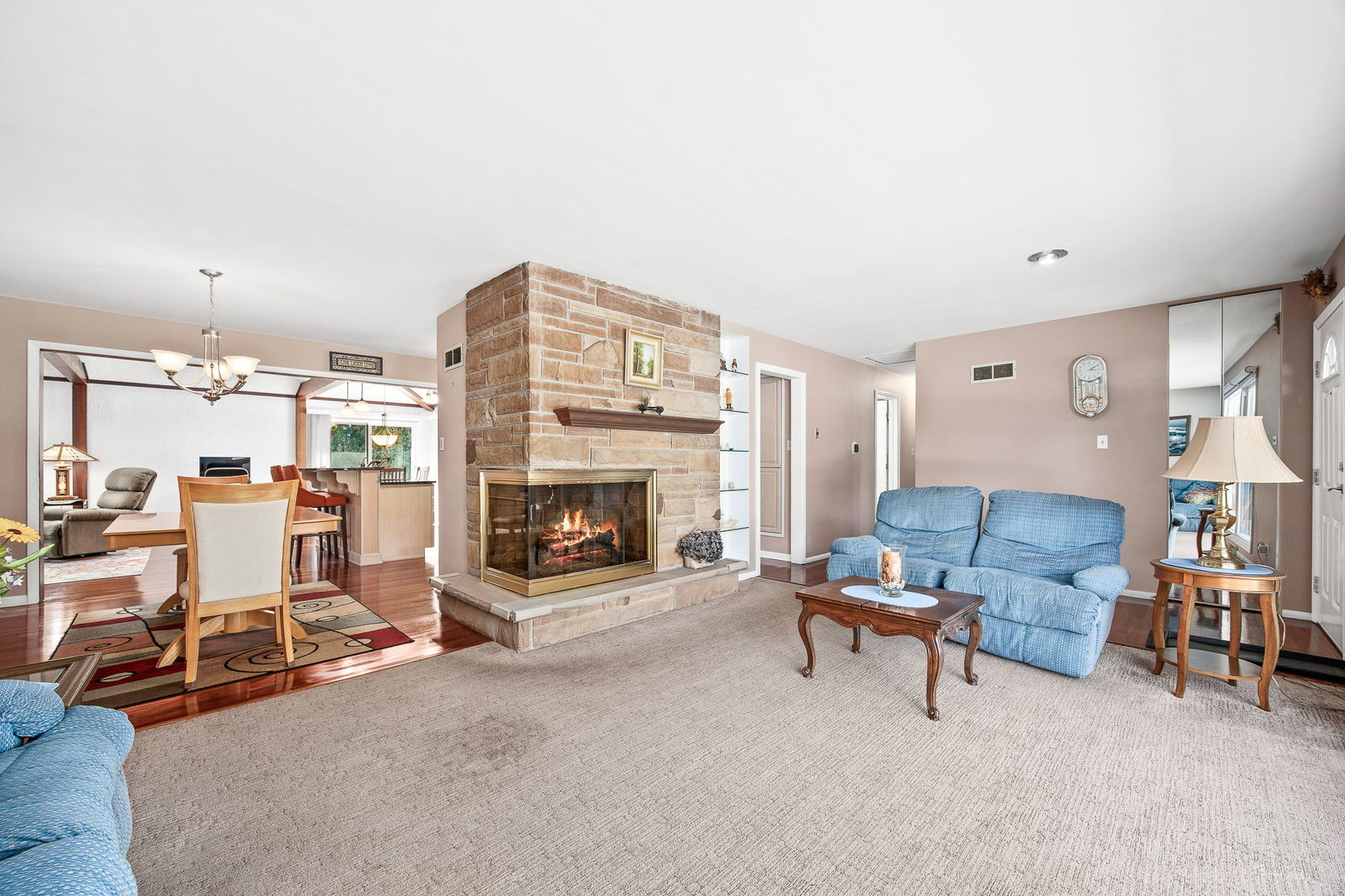 Lovely ranch home meticulously maintained. This is such a fun unique home. Two additions over the years have added wonderful living space. First addition added vaulted family room and expanded kitchen. 2nd addition added primary bedroom with 2 walk in closets, spa bath and 1st floor laundry. An additional furnace/ac was added also. Living room and dining room share a stone corner fireplace. Kitchen has been updated and is open to family room with an island/breakfast bar. Bedroom 2, 3 & 4 all have hardwood under carpet. Hall bath remodel 2021. Newer windows in living and family rooms, garage, basement, & half bath. Skylights in family room and primary bedroom help to make this a sunny, bright house. Hardwood flooring was recently refinished. Main home furnace/ac new in 2020. Garage is just as tidy as home with new epoxy floor and fresh paint. Outdoor space is perfectly cared for. Huge yard. New trex deck (2019). Paver sidewalk/partial driveway recently updated. Exterior house/shed/deck rails painted in 2024. Fabulous location close to schools, shopping, restaurants, playground. Not far from train, town, library. Easy access to highways. Perfect expanded ranch home.