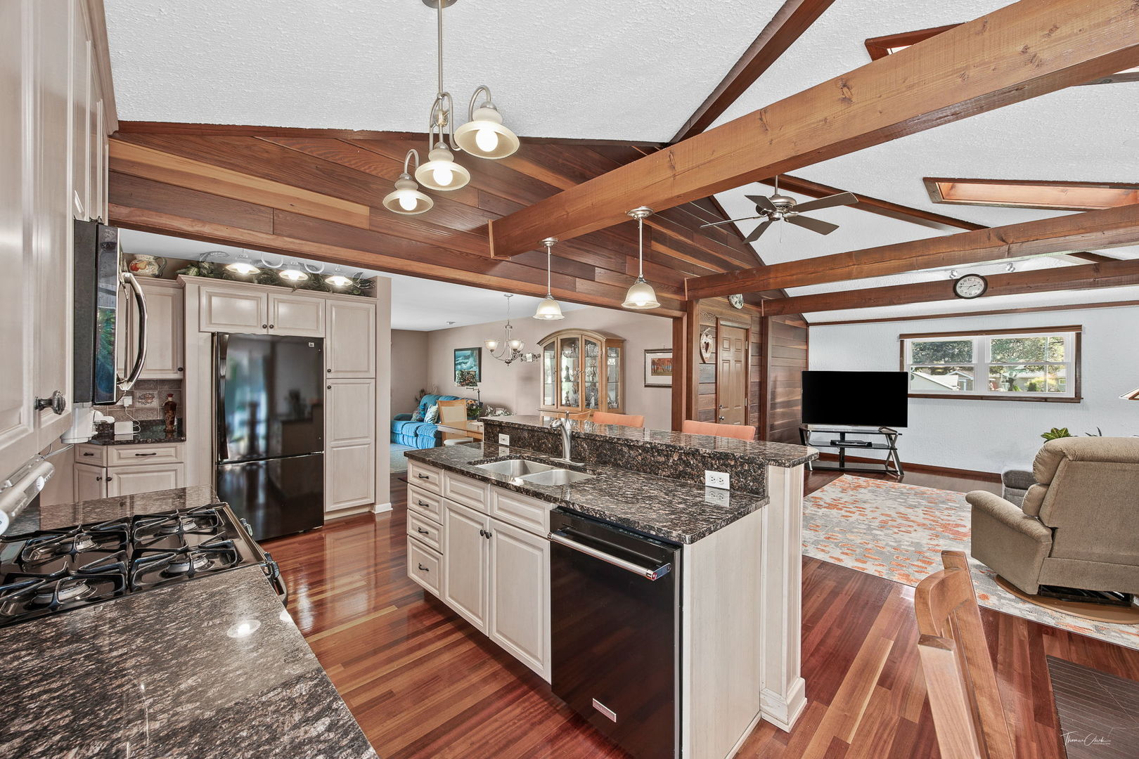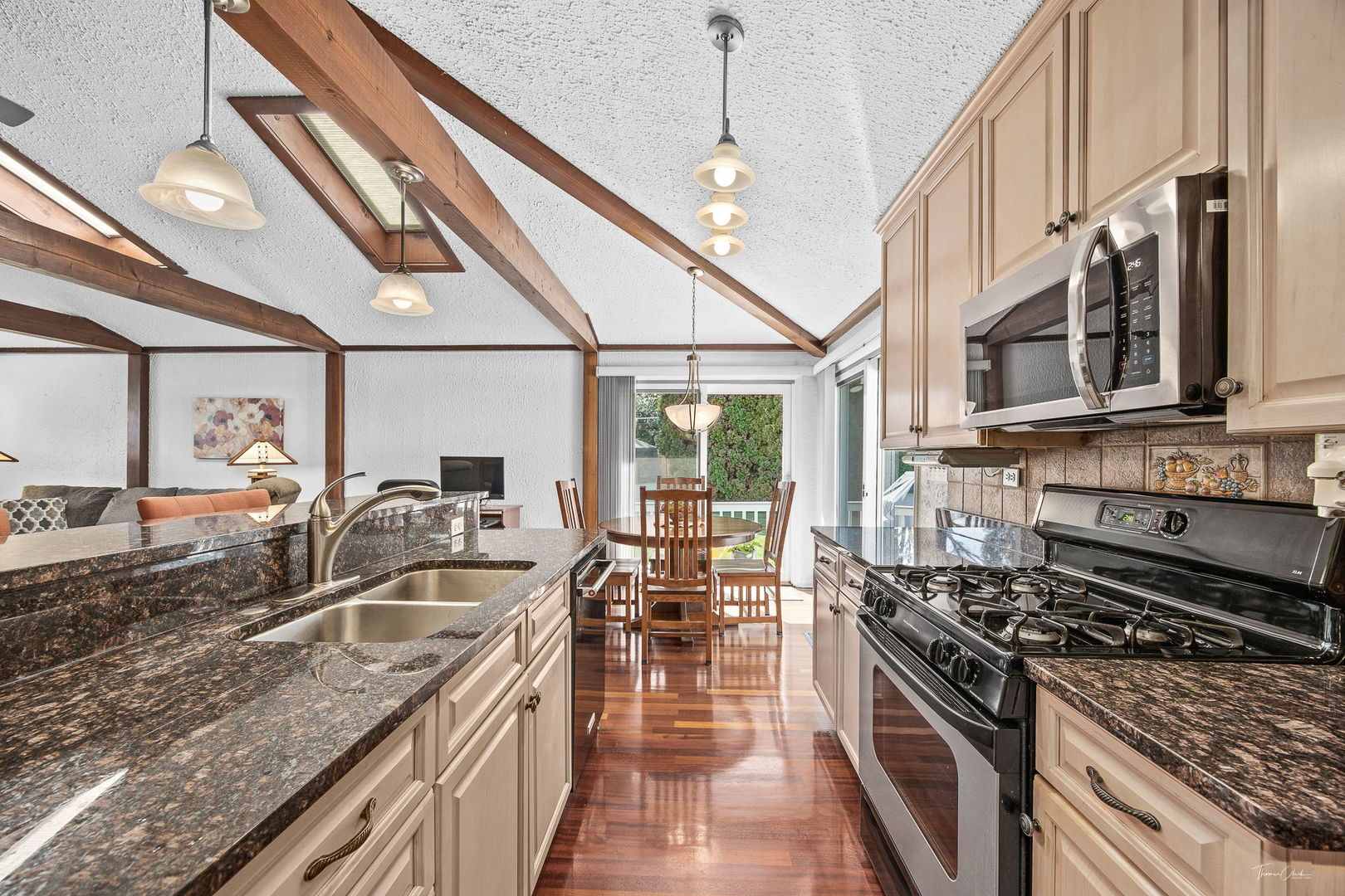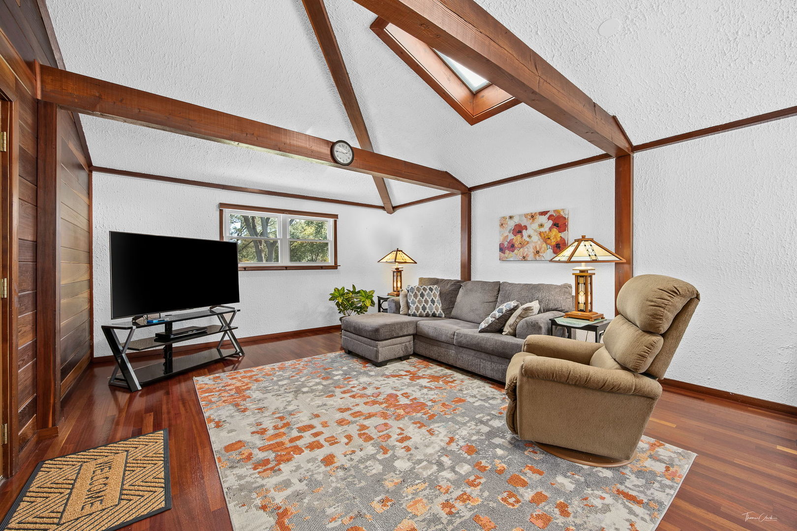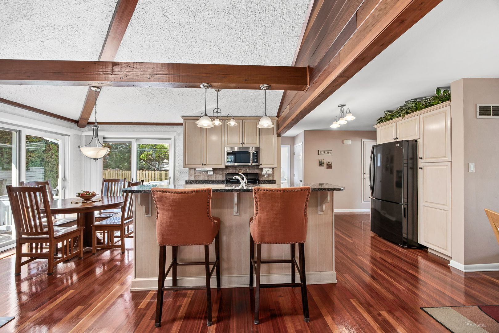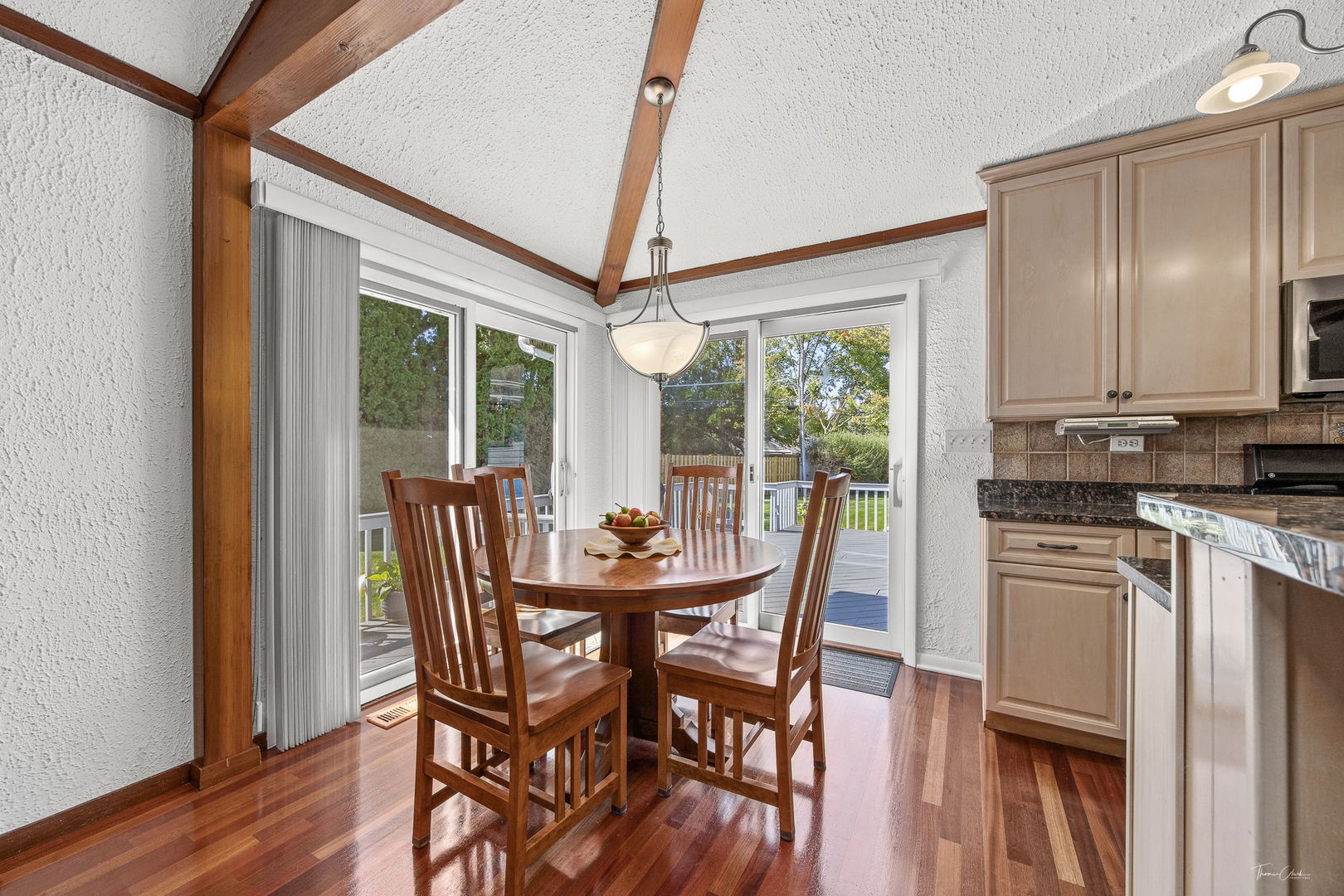 Lovely ranch home meticulously maintained. This is such a fun unique home. Two additions over the years have added wonderful living space. First addition added vaulted family room and expanded kitchen. 2nd addition added primary bedroom with 2 walk in closets, spa bath and 1st floor laundry. An additional furnace/ac was added also. Living room and dining room share a stone corner fireplace. Kitchen has been updated and is open to family room with an island/breakfast bar. Bedroom 2, 3 & 4 all have hardwood under carpet. Hall bath remodel 2021. Newer windows in living and family rooms, garage, basement, & half bath. Skylights in family room and primary bedroom help to make this a sunny, bright house. Hardwood flooring was recently refinished. Main home furnace/ac new in 2020. Garage is just as tidy as home with new epoxy floor and fresh paint. Outdoor space is perfectly cared for. Huge yard. New trex deck (2019). Paver sidewalk/partial driveway recently updated. Exterior house/shed/deck rails painted in 2024. Fabulous location close to schools, shopping, restaurants, playground. Not far from train, town, library. Easy access to highways. Perfect expanded ranch home.